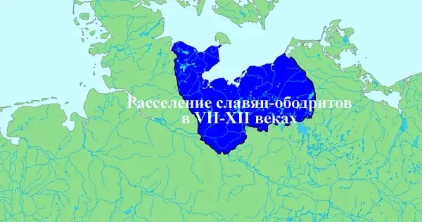 Синим цветом выделена территория расселения славян-ободритов. Археология и топонимика свидетельствуют о том, что ободриты зародились на западных поморских территориях, над рекой Одра. Вероятно, отсюда и произошло их название «Ob Odr», что означает «рядом с Одрой». Ободриты — это термин, используемый для группы из четырех племен. Первые — это ободриты (еще известные как ререги). Некоторые из их крепостей были Мехлин (Мекленбург), Сважин (Шверин), Дубин (Добин), Вышомеж (Висмар) и Илов (Иллов). Вторым ободритским племенем были варны, главной крепостью которых, вероятно, был Радомин (Гросс-Раден). К третьей группе относились полабцы, с крепостью Рацибуж (Ратценбург). Четвертым и последним из ободритов были вагры — второе по силе племя после ободритов. Они контролировали знаменитое пиратское логово — остров Вембрза (также Вембрза, Имбра, позже Фемарн). Их столицей был Старгард (Ольденбург). Еще одним крупным оплотом была будущая столица всех ободритов — Любек.
