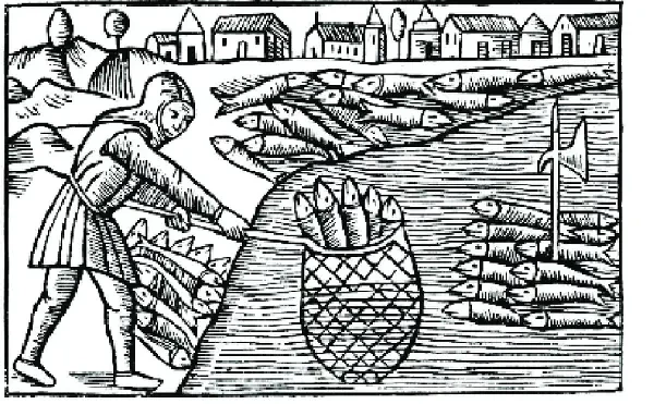 Гравюра на дереве, иллюстрирующая промысел сельди голландскими и английскими моряками в Средние века. Из-за наступления Малого ледникового периода и существенного ослабления Гольфстрима был изменен миграционный путь сельди. Огромные косяки рыбы начали мигрировать из Балтики на просторы Атлантики, где становились добычей главных соперников Ганзы — англичан и голландцев.