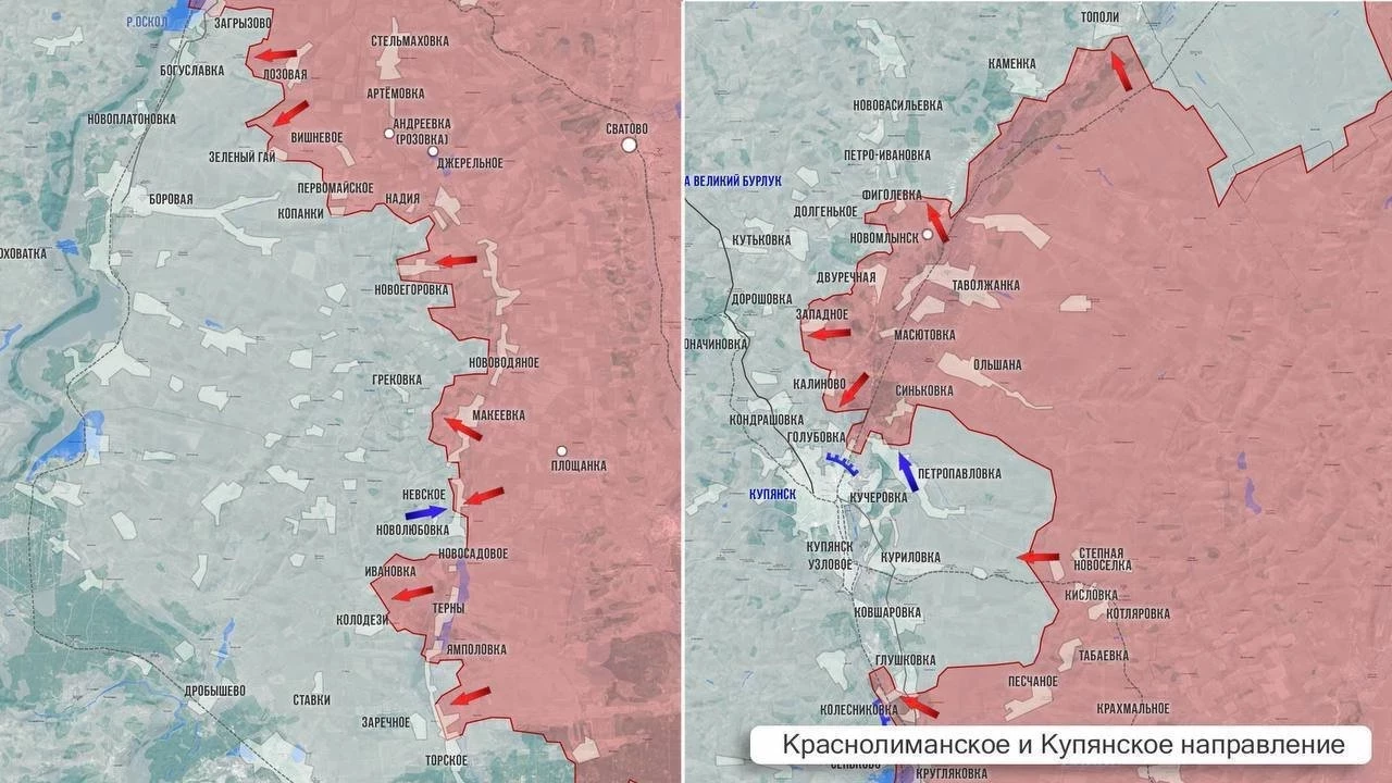 На Купянском направлении ВС РФ пробиваются в районе Степовой Новосёловки. Севернее по фронту наши укрепляют плацдарм за Осколом, который сейчас составляет примерно 34 км в ширину и до 4 км в глубину. В ближайшее время ВС РФ могут усилить давление на Купянск, обогнув реку. В долгосрочной перспективе позиции на западном берегу Оскола могут быть использованы для наступления на Харьков.