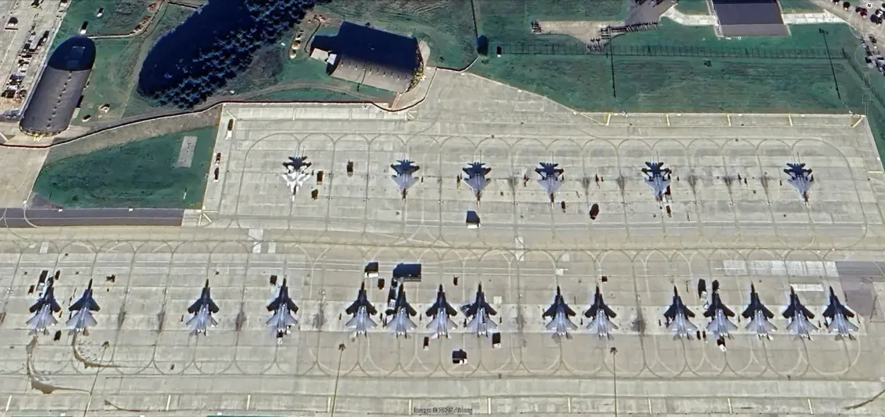 Спутниковый снимок Google Earth: истребители F-35A и F-15E на авиабазе Маунтин Хоум. Обратите внимание на разницу в геометрических размерах самолётов