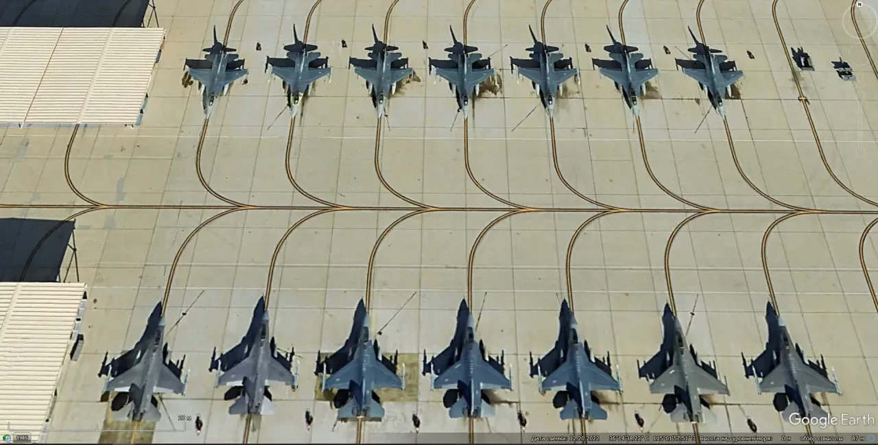 Спутниковый снимок Google Earth: истребители F-16C на авиабазе Неллис