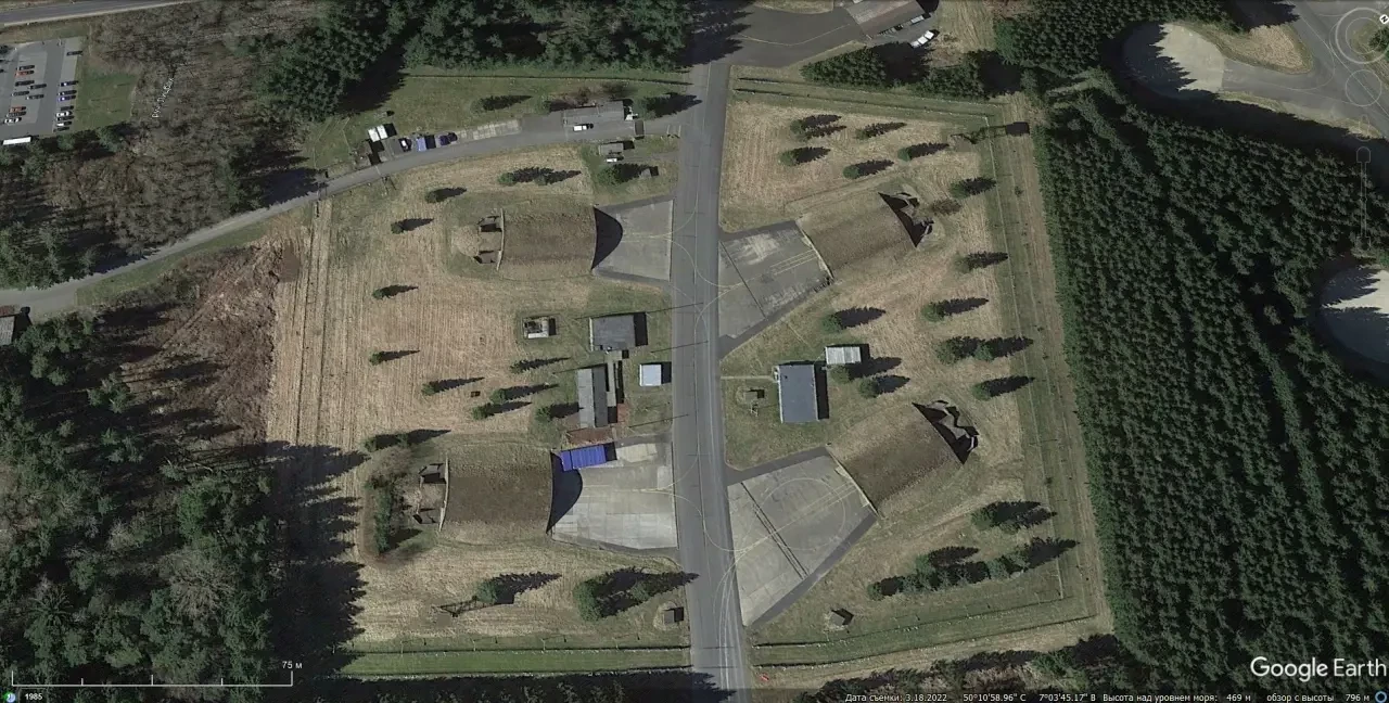 Спутниковый снимок Google Earth: подземные ядерные хранилища поросшие растительностью на авиабазе Бюхель