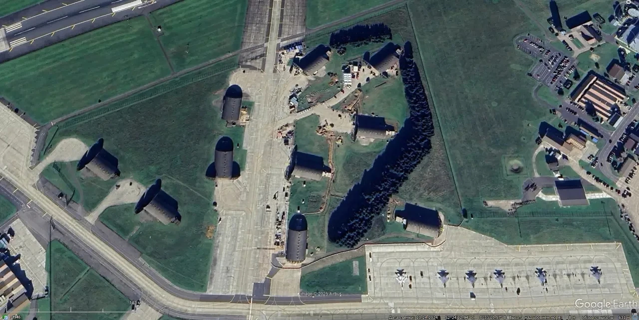 Спутниковый снимок Google Earth: укрытия рядом со стоянкой истребителей-бомбардировщиков F-15E на авиабазе Лейкенхит