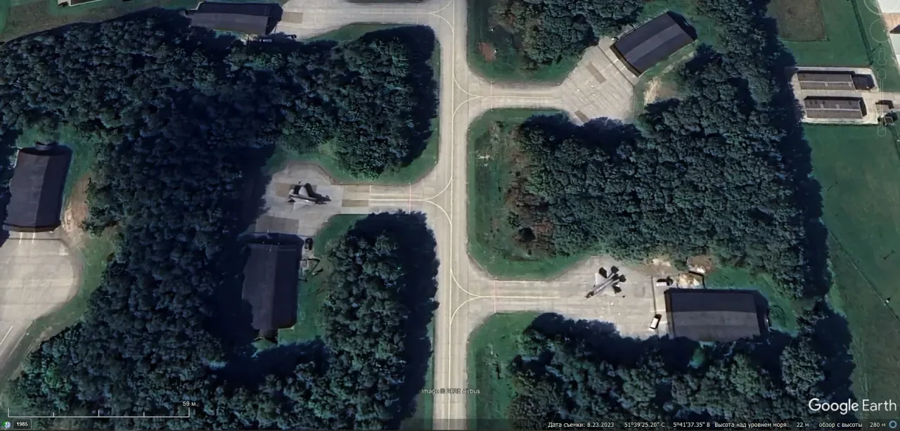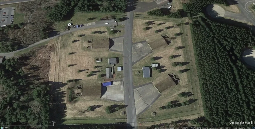 Спутниковый снимок Google Earth: комбинированные укрытия на авиабазе Бюхель