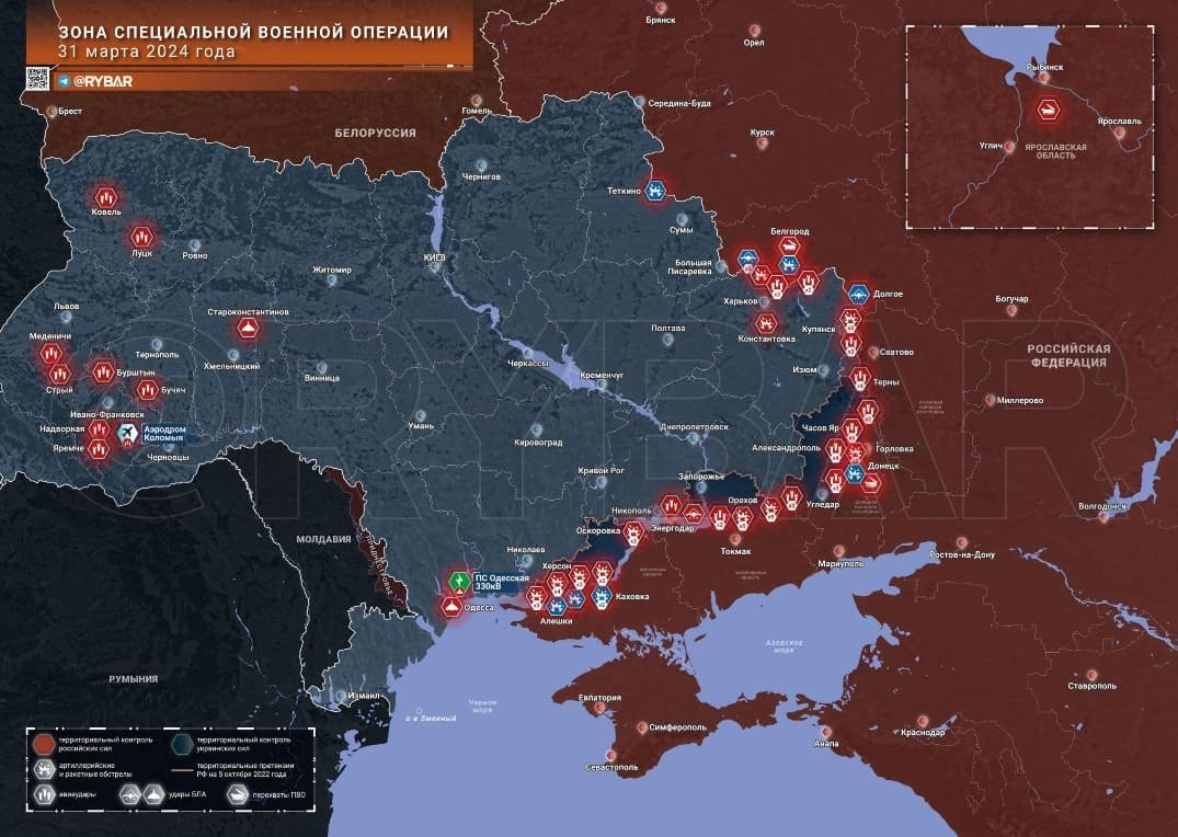 Сводка от 1 апреля 2024 года - карта боевых действий, ситуация на фронтах Украине, ход специальной военной операции (СВО). Активное продвижение российских войск отмечается на нескольких направлениях и одновременно с этим поступают сообщения о нанесении высокоточных ракетных ударов по тыловым объектам противника.