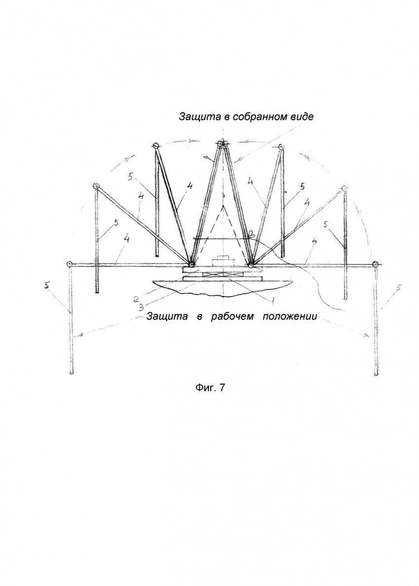 Нетривиальным вариантом защиты от FPV-дронов и сбросов можно считать различные вращающиеся элементы – цепи, лопасти, трубы и так далее. В одном из исполнений предлагается пространственная конструкция из труб с семью электромоторами и пропеллерами. Таким образом, автор пытается организовать круговую защиту от атакующих дронов. В качестве двигателя для пропеллеров, по всей видимости, можно использовать элементы БПЛА сельскохозяйственного назначения – в простонародье «Баба-Яга». Из описания патента: