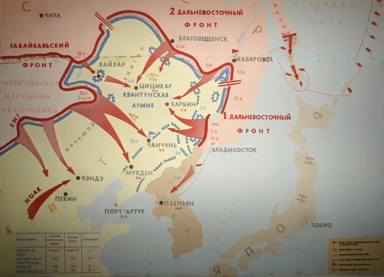 Советским войскам противостояла Квантунская армия, численность солдат которой достигала 750 тысяч человек, количество танков и самоходных орудий – 1155, самолетов – 1800, кораблей и катеров – 30. Но 10 августа 1945 г. командованию Квантунской армии были подчинены также войска Корейского фронта и 5-я японская воздушная армия. Число японских солдат и офицеров теперь превышало миллион человек, однако благодаря хорошей организации и грамотному сосредоточению сил, наши войска превосходили японские по численности в 1,7 раза, по танкам – в 4,5 раза, по числу самолетов – в 2,8 раза. Общее руководство боевыми операциями сухопутных войск, авиации и флота осуществлял маршал А. М. Василевский.