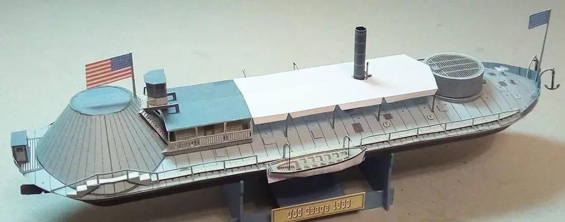 Радует, что все самые оригинальные боевые корабли северян и южан сегодня нашли свое воплощение во множестве бумажных моделей. В частности, есть модель броненосца «Чилликоте» — по сути, это был… «тупоносый плот», однако с боевым казематом и двумя гребными колесами.