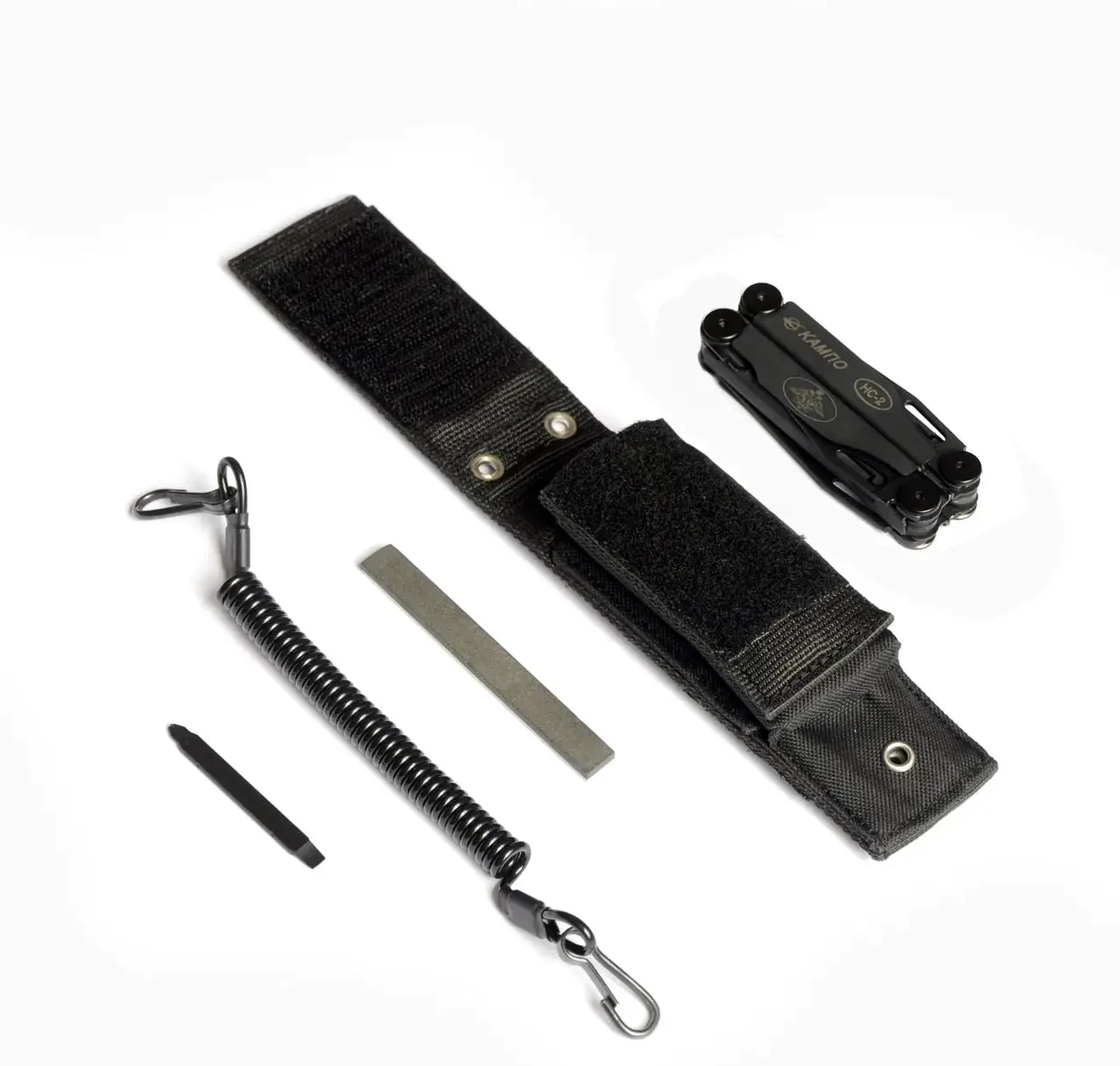 Помимо самого ножа, в комплект поставки входит чехол, страховочный ремешок, брусок для заточки с алмазным напылением, биты с прямым и крестообразным шлицем, а также литол.