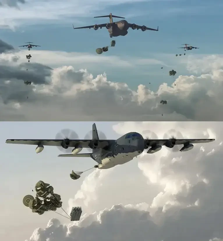 Сброс кассет системы Rapid dragon c крылатыми ракетами с самолётов Lockheed C-130H Hercules