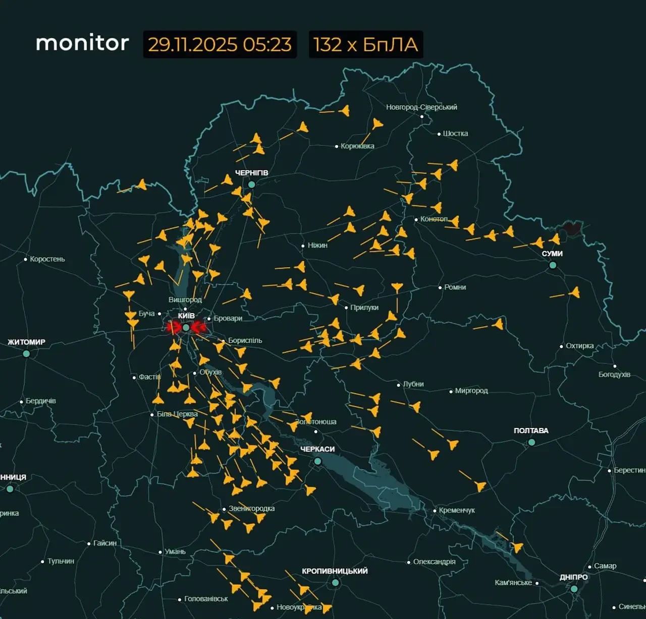 Поступают сообщения о том, что на цели в Киеве, Броварах и других населённых пунктах украинского столичного региона было направлено не менее сотни БПЛА «Герань». Также есть информация о пусках ракет Х-101 с бортов бомбардировщиков Ту-95МС.
