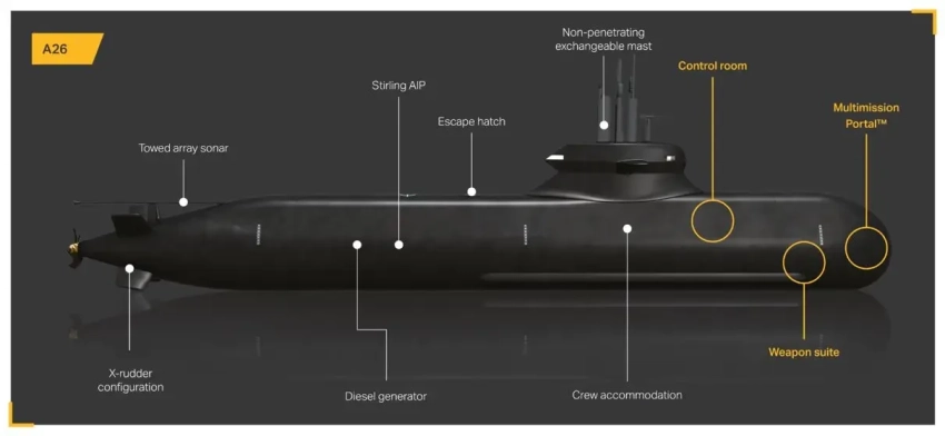 Подлодка A26 должна нести сложный комплекс разнообразной электроники. Так, предлагается несколько разных гидроакустических комплексов и станций для обзора передней, боковых и нижней полусфер. Также предусмотрены телескопические мачты с радиолокатором и оптико-электронной станцией для использования в надводном положении.