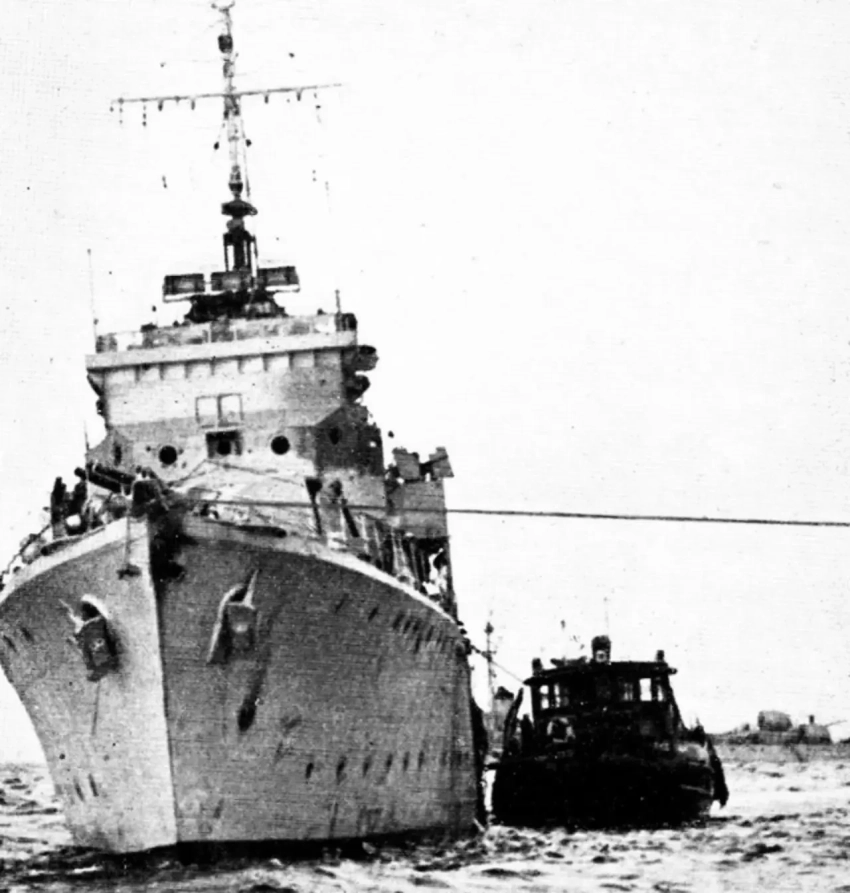 В 17:20 первая ракета, которая навела на дымовую трубу эсминца, поразила корабль в районе мидель-шпангоута, в районе машинного отделения. В результате попадания нос и корма оказались практически не повреждены, но весь центр корабля превратился в груду металлолома (возможно, силы взрыву придали расположенные в районе попадания торпедные аппараты, но это не точно). Корабль потерял ход, но по инерции продолжал поворот, повернувшись практически на 180 градусов.