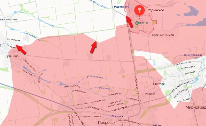 Сегодня стало известно о новом продвижении в российской армии районе села Гришино, что к северо-западу от освобождённого Красноармейска. ВСУ потеряли значительную часть как самого Гришино, так и окрестностей населённого пункта.