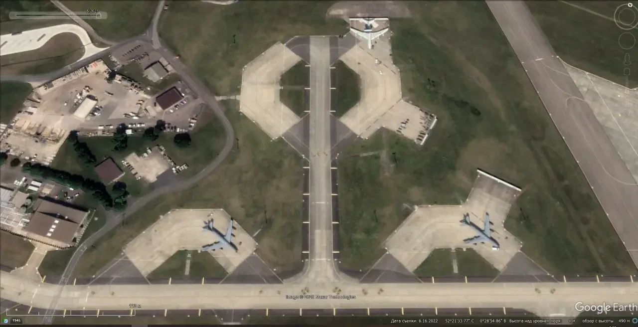 Спутниковый снимок Google Earth: самолёт ДРЛО Boeing E-3G Sentry и самолёты-заправщики Boeing KC-135 на авиабазе Милденхолл в Великобритании. Снимок сделан в июне 2022 года