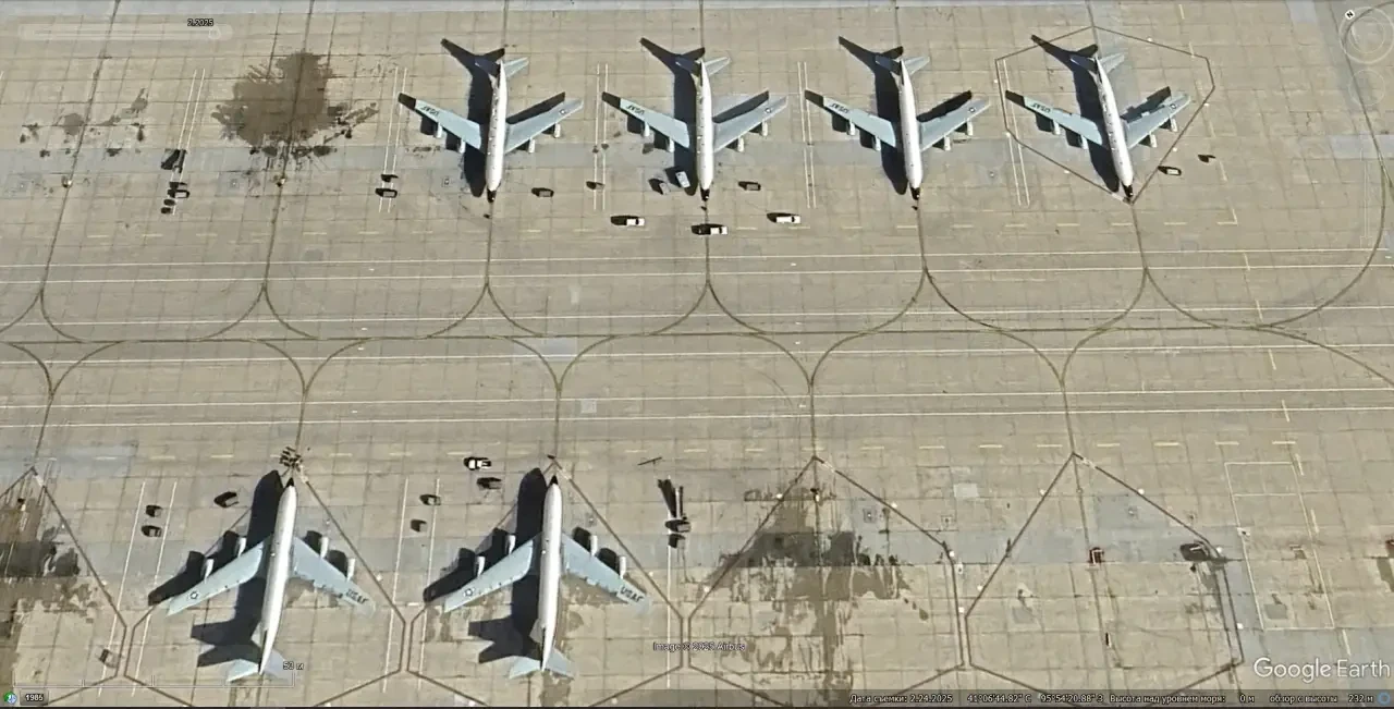 Спутниковый снимок Google Earth: разведывательные самолёты Boeing RC-135 различных модификаций на авиабазе Оффут