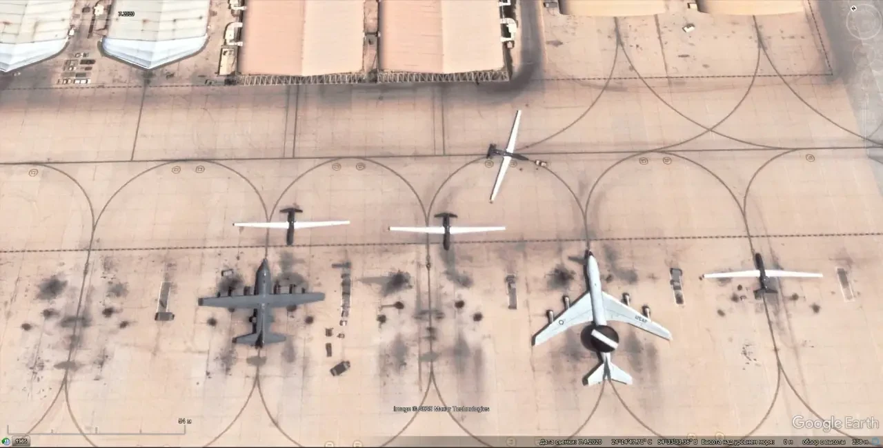 Спутниковый снимок Google Earth: БПЛА Northrop Grumman RQ-4В Global Hawk, самолёт ДРЛО Boeing E-3G Sentry и военно-транспортный Lockheed C-130H Hercules на авиабазе Аль-Дафра. Снимок сделан в июле 2020 года