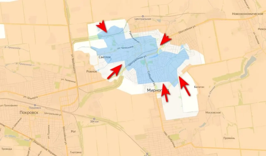 Российские войска выбили украинские формирования из южной части Мирнограда, в Генштабе ВСУ подали это как «совершение маневров» с целью «выравнивания фронта». В Киеве продолжают утверждать, что никакого окружения в Мирнограде (Димитрове) якобы нет.