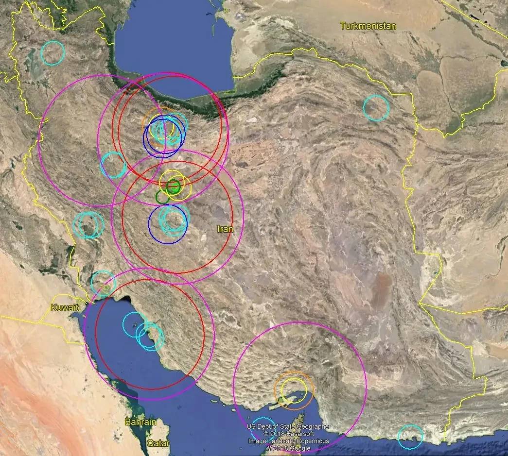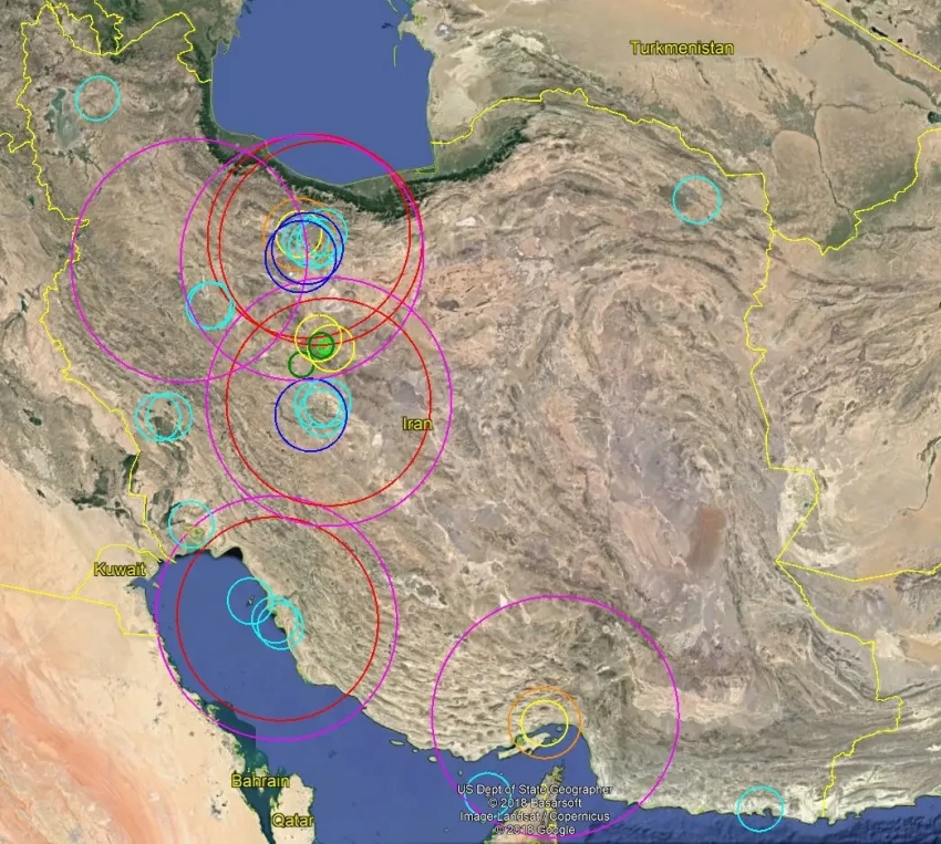 Примерные зоны поражения иранских ЗРК в 2018 году. Розовые круги — С-300В, красные — С-300ПМУ2, оранжевые — Raad. Bavar-373 тогда был прототипом, и на схеме его нет. В 2025-м эта ПВО была существенно сильнее, чем тогда. Израильтяне свободно действовали внутри зон поражения на севере страны. Источник: Irangeomil