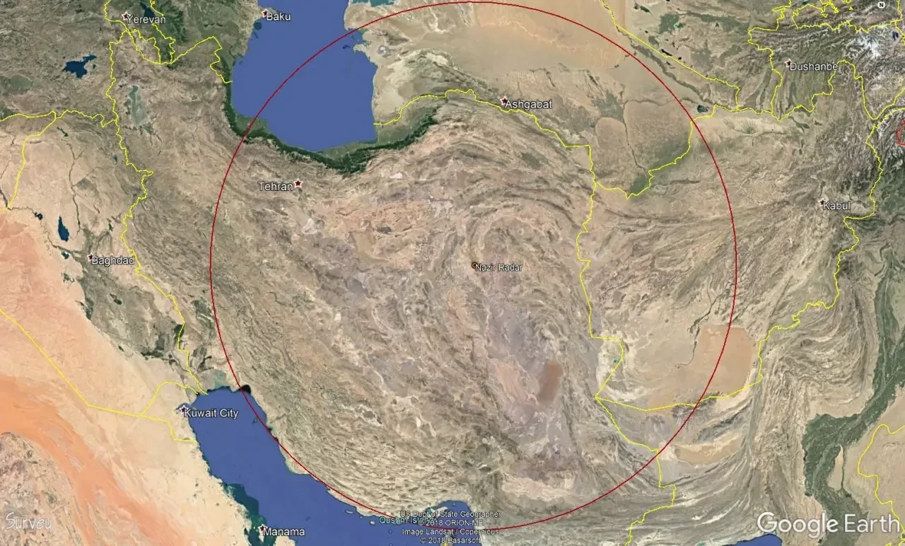 Зона действия иранской загоризонтной РЛС Nazir в 2018 году. Она могла обеспечить ПВО данными о целях, находящихся на большом расстоянии. Источник: Irangeomil