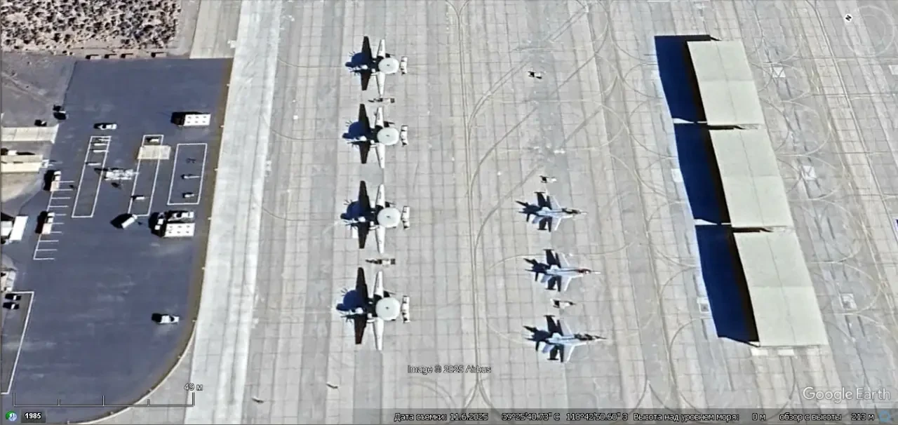 Спутниковый снимок Gооglе Eаrth: самолёты Northrop Grumman E-2С Hawkeye и Boeing F/A-18E/F Super Hornet на авиабазе Фаллон. Снимок сделан в ноябре 2025 года