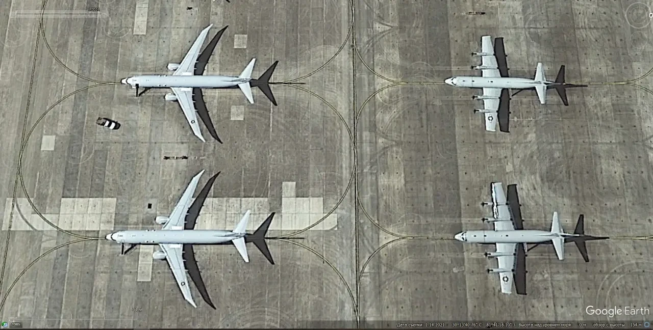 Спутниковый снимок Gооglе Eаrth: самолёты Lockheed P-3 LRT Orion и Lockheed P-3 AEW Orion на аэродроме Сесил-Филд. Снимок сделан в январе 2021 года