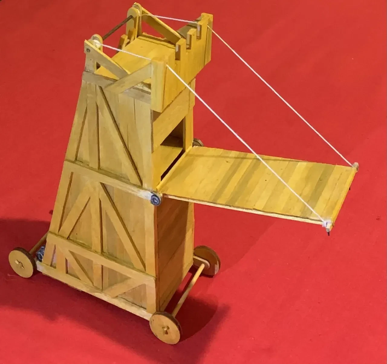 Макет такой осадной башни совсем не трудно сделать из палочек-мешалочек для кофе, склеенных клеем ПВА. Надо только иметь в виду, что они бывают разные. Для нашей цели лучше всего подходят самые длинные и толстые: 178х6х1,3 мм. Из них получаются отличные несущие балки. А вот на сами «доски» для обшивки башни годятся более короткие и тонкие: 140х5х1 мм.