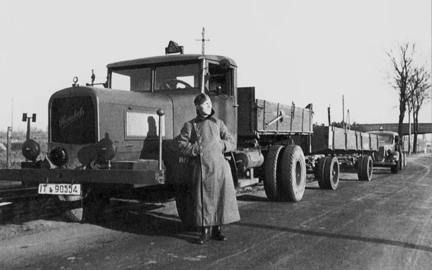 На снимке изображён один из стандартных лёгких полноприводных грузовиков ремонтного подразделения, известный как Einheits-Lkw (единый грузовой автомобиль) или Einheits-Diesel. Это унифицированная модель грузовика грузоподъёмностью 2,5-3 тонны, разработанная в конце 1930-х годов для ремонтных нужд. Машины производили MAN, Magirus, Bussing-NAG, Mercedes-Benz и другие