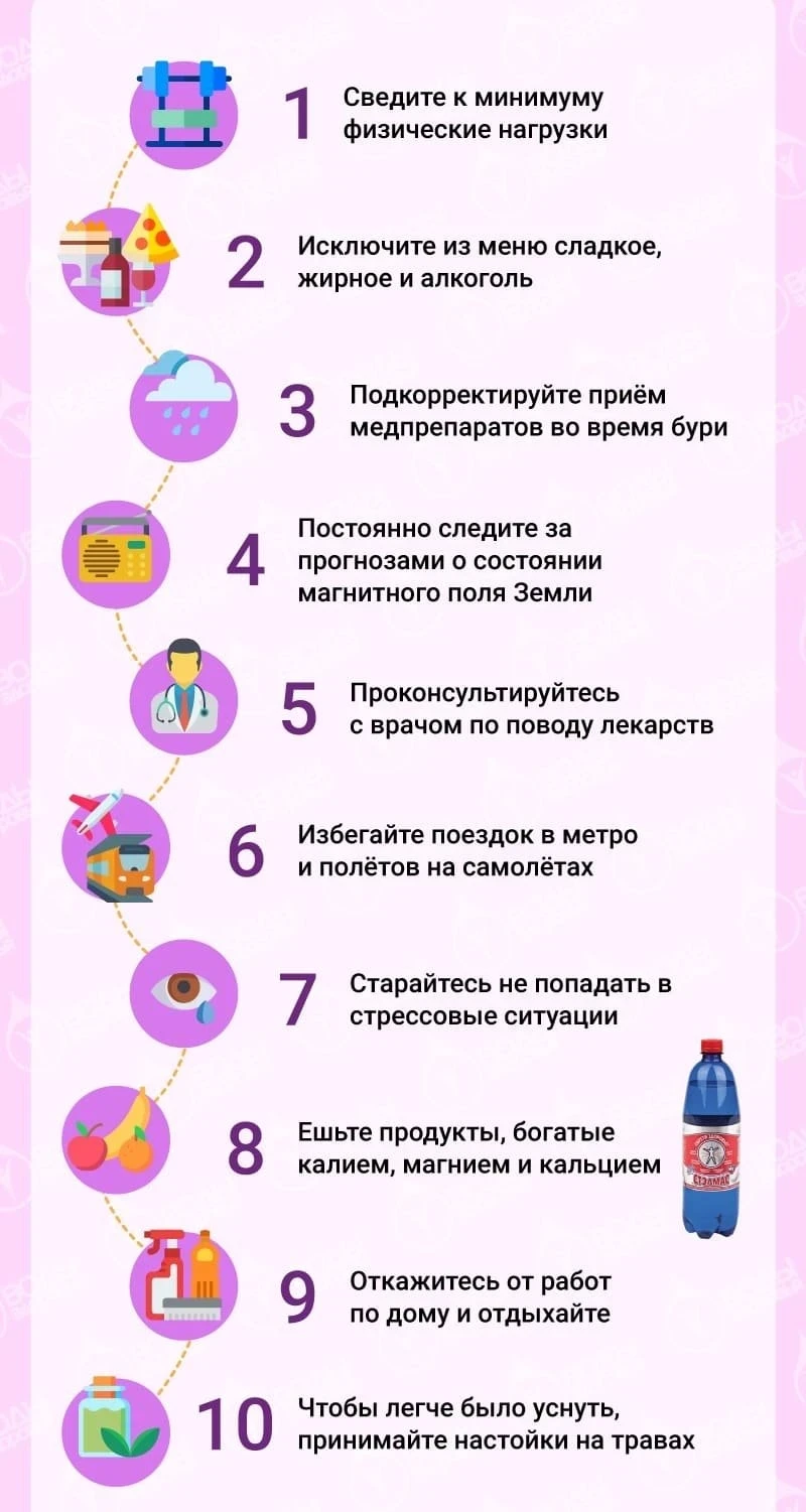Пожилым людям, беременным женщинам и пациентам с хроническими болезнями в дни прогнозируемых магнитных бурь стоит проявить осторожность. Лучше снизить физические нагрузки, но не стоит отказываться от спокойных вечерних прогулок. Рацион надо сделать лёгким, ограничив жареную, острую и соленую пищу, а также алкоголь, и увеличив потребление овощей, фруктов и воды.