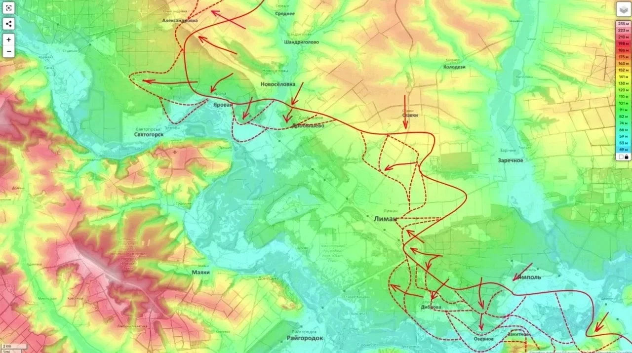 Очень напряжённая обстановка на сегодняшний день складывается в районе Красного Лимана. Российские войска подошли к городу с севера, завязав бои непосредственно в городской черте.