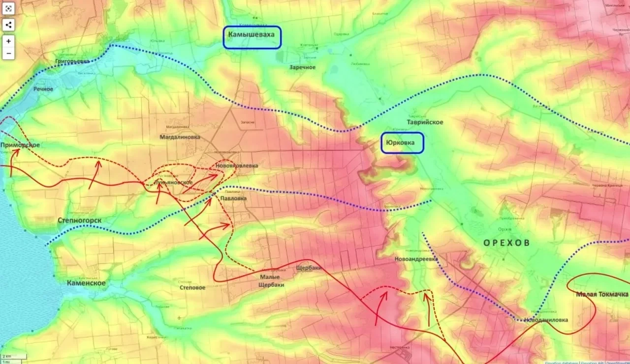 По оценке аналитика, после завершения зачистки Приморского российские войска могут развить наступление в сторону Магдалиновки и Камышевахи, создавая плацдарм для будущего броска на Запорожье.