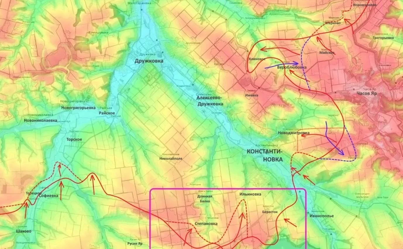 Если смотреть не по отчетам, а по карте, становится ясно: речь идет о постепенном сжатии обороны ВСУ на подступах к крупному узлу - Славянску и Краматорску. Эти города для киевского командования давно стали не просто населенными пунктами, а символами удержания севера Донбасса и ключевыми логистическими точками всей группировки.