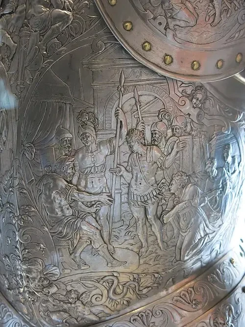 Став королем, Генрих II вкусам не изменил и заказал себе еще один комплект рыцарских доспехов из полированной стали с вычеканенными на них сценами Троянской войны. На первый взгляд они смотрятся беднее предыдущих доспехов, однако при внимательном рассмотрении становится очевидно, что для того, чтобы прочеканить все эти фигуры, требуется просто потрясающее мастерство. Недаром этот королевский доспех выставлен именно в Лувре.