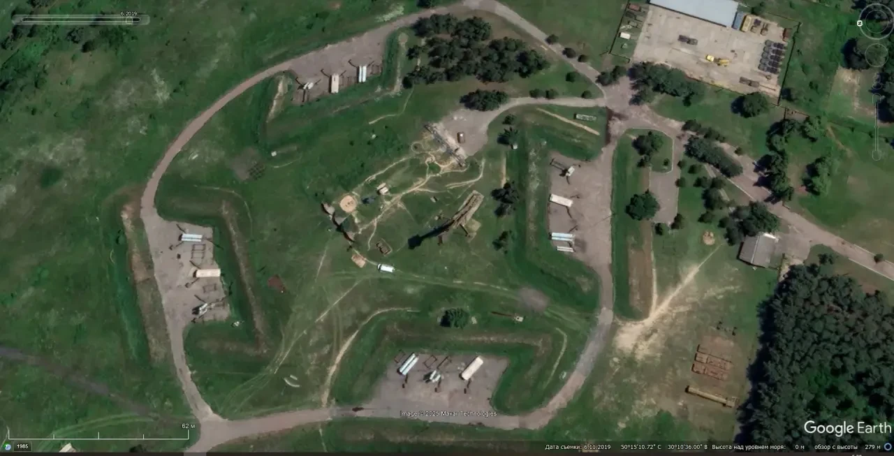 Спутниковый снимок Googlе Еarth: позиция ЗРС С-300ПТ под Киевом в 8 км западней авиабазы Васильков. Снимок сделан в июне 2019 года