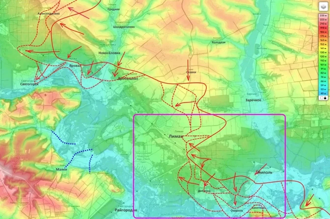 Одним из наиболее напряжённых участков остаётся север, а именно Лиманское направление. В районе Лимана и Святогорска, по данным Подоляки, российские подразделения ведут наступление с целью охвата украинской группировки. Штурмовые действия разворачиваются у Дробышево и в окрестностях Святогорска, с продвижением через лесные массивы и район Дибровы.