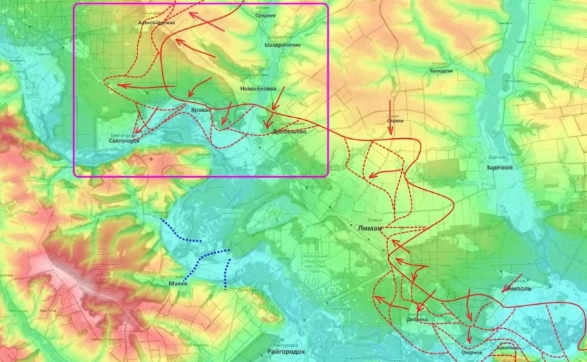 Если взглянуть на карту, становится понятно, что сейчас российские войска берут Святогорск в своеобразные клещи, отрезая его от коммуникации с Лиманом, штурм которого уже идет, и Славянском, сообщает "Военное обозрение".