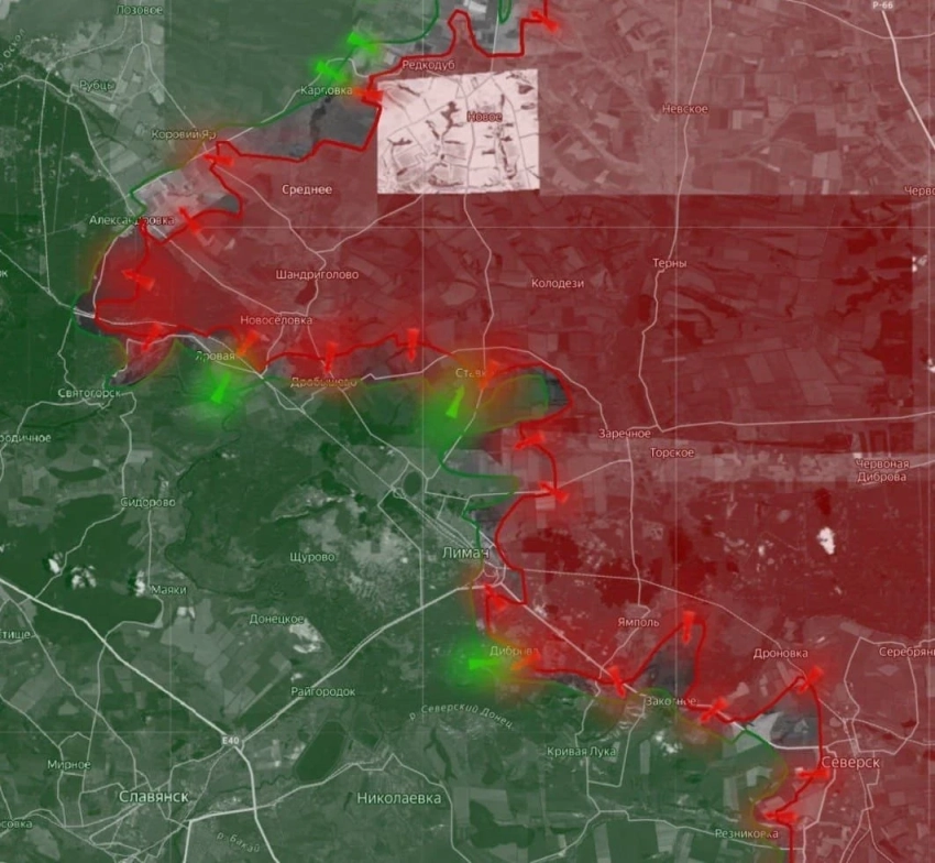 На Краснолиманском фронте ВС РФ расширяют зону контроля в районе Александровки, Святогорска и Яровой. Также ведут бои на восточных окраинах Красного Лимана. Выше по карте в районе Боровой ВС РФ выравнивают линию фронта, закрывая остававшиеся там «карманы».