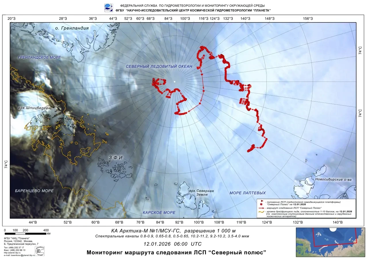 Маршрут дрейфа в ходе экспедиции «Северный полюс-42» по состоянию на 13 января 2026 г.