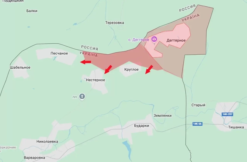 Сегодня ВС РФ, продвигаясь со стороны ранее переведённого под контроль села Дегтярное, заняли ещё около 8 квадратных километров территории, выбив противника из села Круглое и подойдя вплотную к Нестерному и Песчаному.