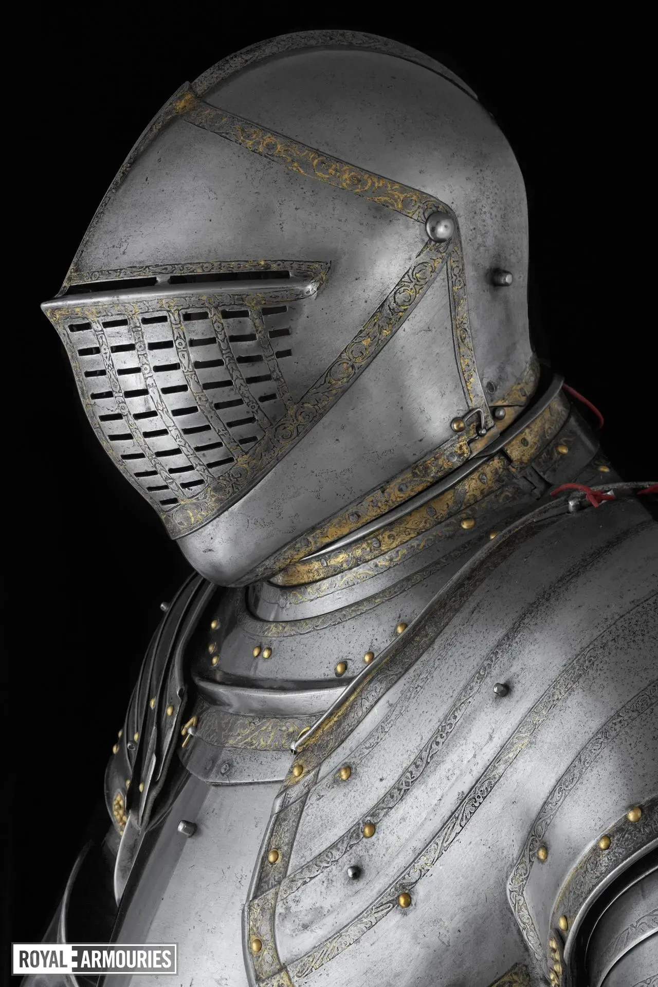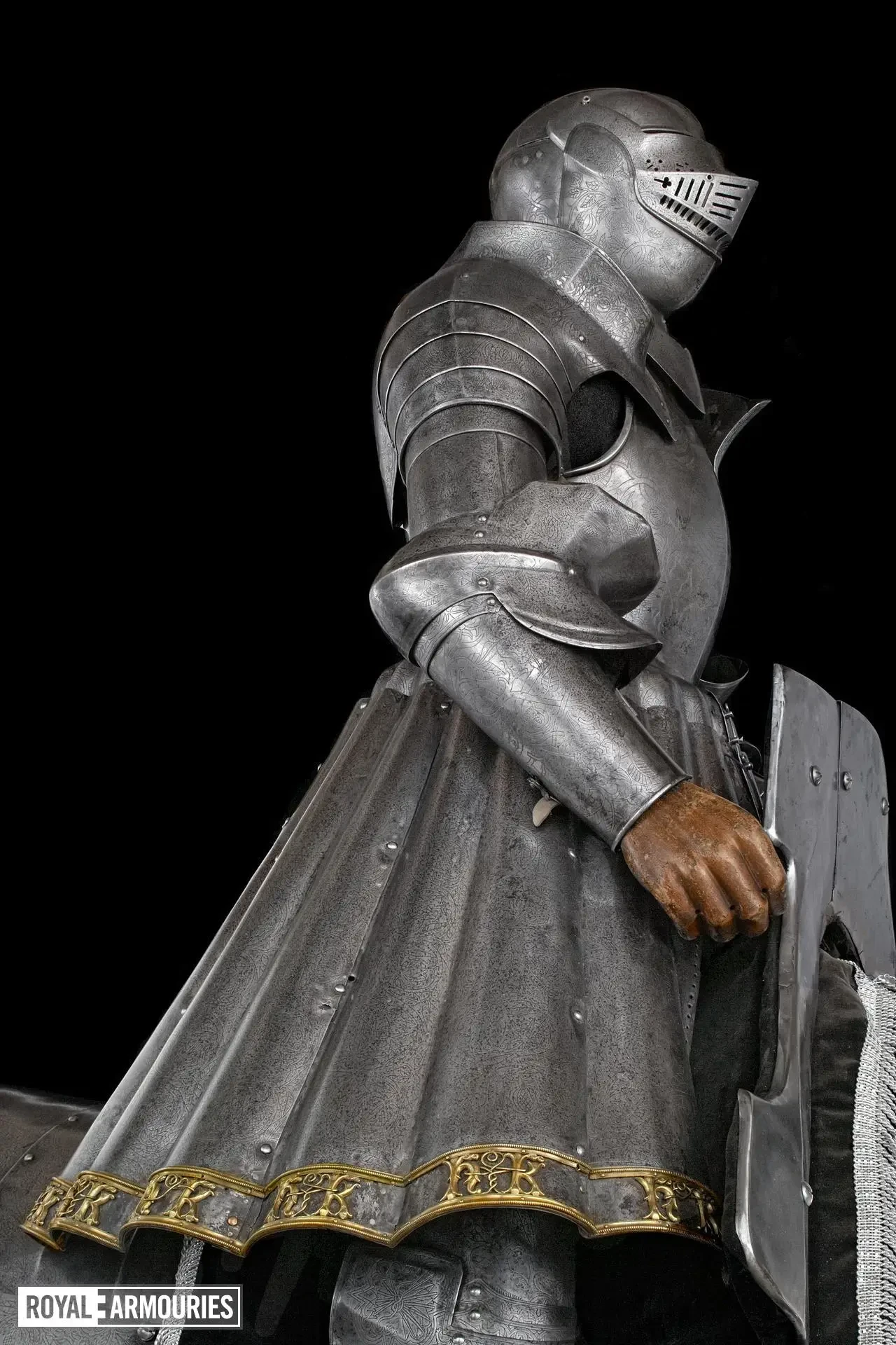 Поверхность всех доспехов изначально была посеребрена и позолочена, а основа гравюры была заштрихована для ее сохранения; в нескольких местах серебро сохранилось. Край «юбки» украшают позолоченные буквы «Г» и «К» — Генрих и Екатерина, то есть в этих доспехах Генрих VIII, видимо, должен был красоваться на своей свадьбе с Екатериной Арагонской! А вот и размеры деталей этого доспеха: высота кирасы 356,0 мм, ширина кирасы 324,0 мм, высота шлема 298,0 мм, ширина шлема 190,5 мм, вес шлема 3,215 кг. Общий вес 30,113 кг.