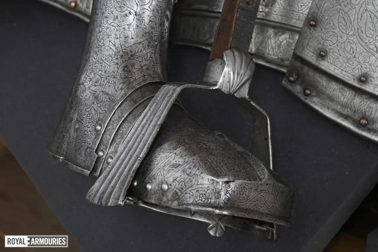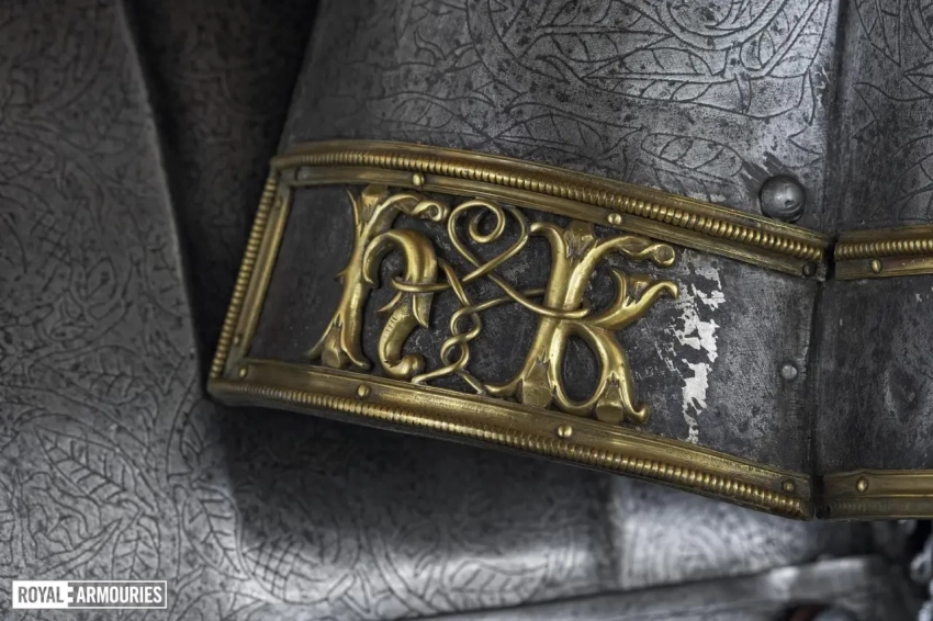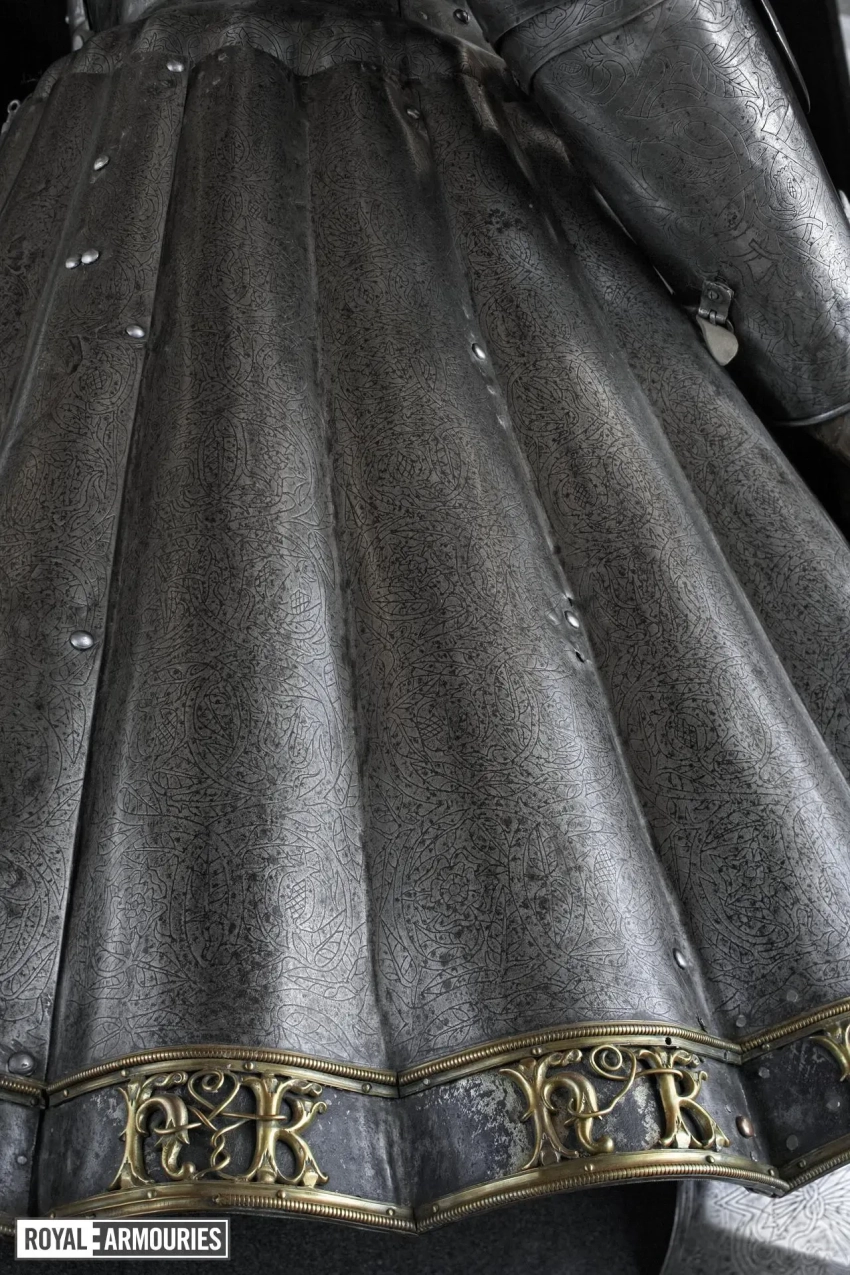 Интересно, что доспехи эти украшены множеством гравированных элементов. Металла, свободного от гравированных изображений, на них практически нет совсем. На нагруднике изображен Святой Георгий, а на спине — Святая Варвара. Остальная часть доспехов украшена узором из вьющихся ветвей, из которых произрастают тюдоровские розы и гранаты Гранады, а на набедренниках — геральдические лилии.