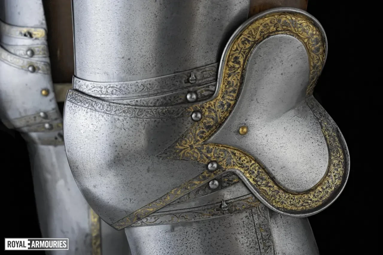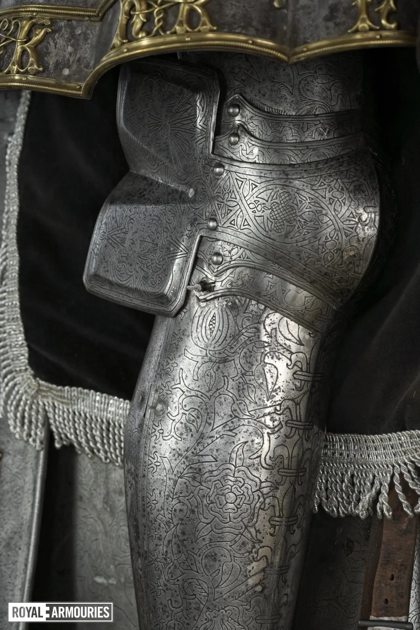 Наколенники с изображением на пластинах «раковин» пучка стрел Арагона и объединенного герба Тюдоров и Екатерины Арагонской – половинки розы и цветка граната