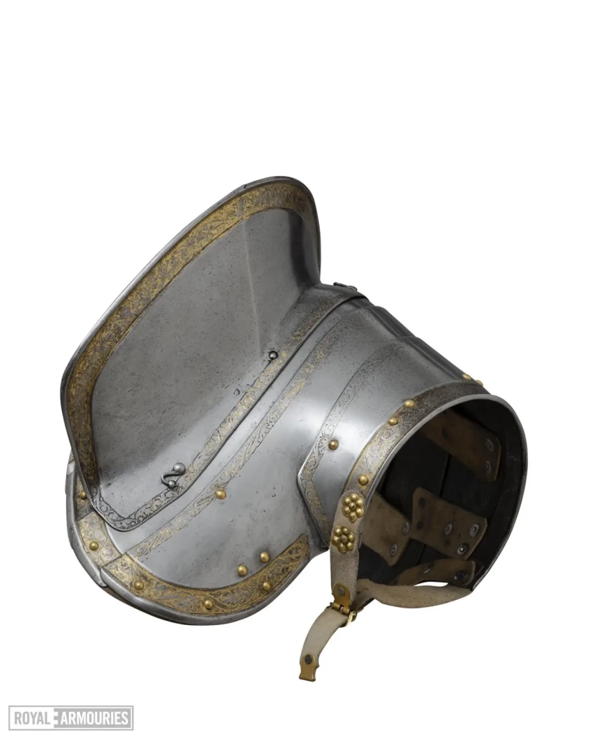 Шлем, по-видимому, изначально был изготовлен для крепления к верхней пластине горжета, но полый фланец на нижнем краю был удален. Сам горжет имеет две подвижные пластины на шее и должен был носиться поверх кирасы; основные пластины имеют рельефную форму, позволяющую им заходить за изгибы верхних краев нагрудной и спинной пластин.