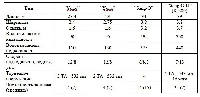 ⁎ Лодки типа «Sang-O» строились в различных вариантах: ударные, вооруженные четырьмя (по другим данным – двумя) торпедными аппаратами калибра 533 мм; спецназначения (предположительно построено 2 ед.), снабженные шлюзовой камерой для боевых пловцов и их носителей, кроме того, эти ПЛ могут нести до 16 морских мин на внешней подвеске.