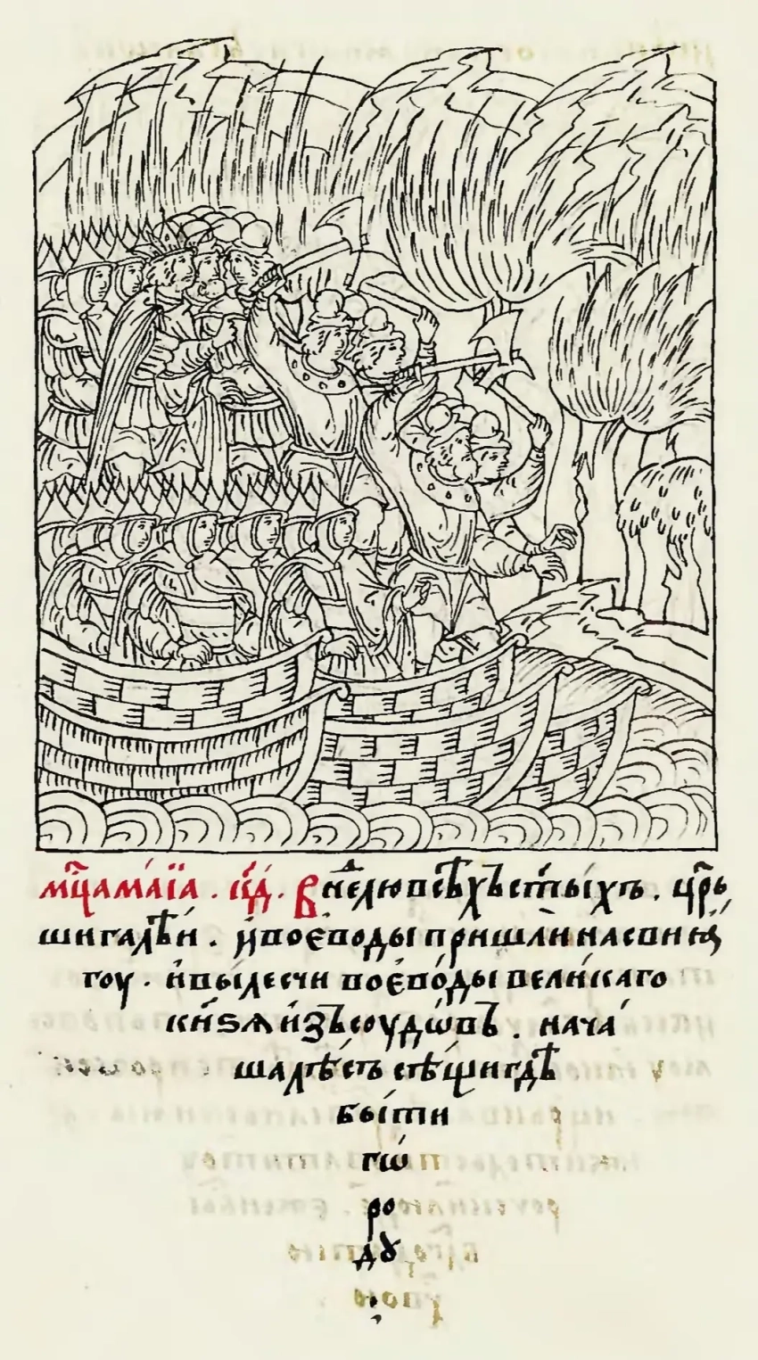 Возникает крамольная мысль: вдруг перед нами еще одна аллюзия, только не на Библию или античные памятники, а на родные русские летописи? Вспомним хотя бы уже упомянутый речной рейд воеводы Ивана Руно в 1469 году. Здесь вам и атака ранним утром, и разграбление казанского посада, и, наконец, освобождение множества русских пленных. В конце концов, подобные заимствования – обычное дело для русских хронистов. Например, острог (контрвалационная линия) вокруг казанского кремля в ходе первого взятия Казани в 1487 году с большой вероятностью был заимствован из описания еще одной кампании 1469 года – поволжского похода под руководством брата Ивана III, удельного князя Юрия Васильевича. Так почему бы и здесь, в сообщении об изгоне молодцев Серебряного в 1551 году, не обратиться к славным временам Ивана III и не подсмотреть пару эпизодов?