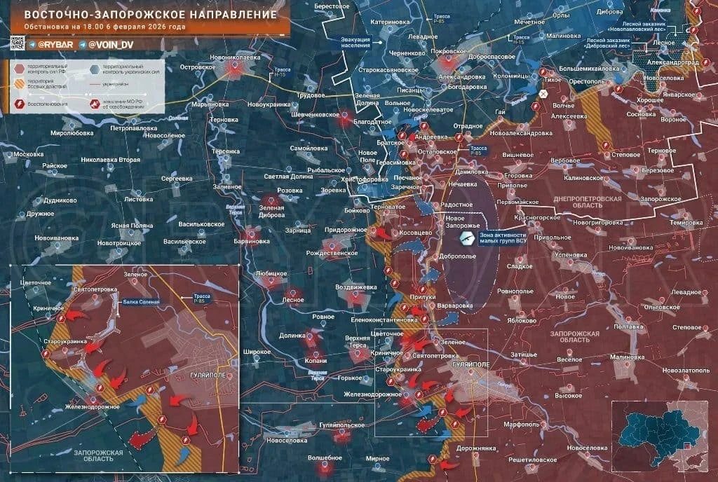 Продвижение Вооружённых сил Российской Федерации (ВС РФ) в зоне проведения специальной военной операции (СВО) признаёт даже противник. В частности, успешные действия российских военных имеют место как на территории Донбасса, так и в Запорожской и Херсонской областях. Кроме того, в последние дни они освободили важные территории в рамках создания зоны безопасности для приграничных районов. Наш сайт echonedeli.ruсобрал последние данные о боях в зоне СВО на основе свежей карты боевых действий на 7 февраля 2026 года.
