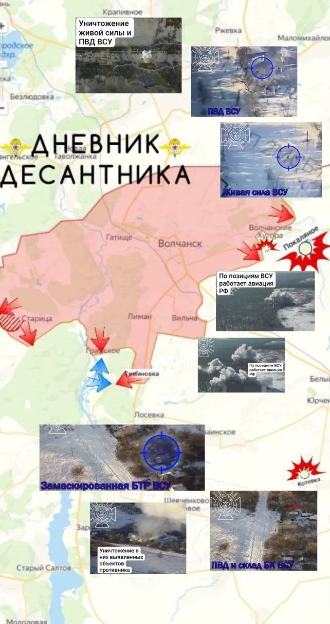 В Волчанских Хуторах продвижение идет при массированной поддержке авиации. Авиаударами ФАБ-500 с УМПК поражены позиции врага в лесах у Покаляного. Важным успехом стало уничтожение позиции элитного подразделения БПЛА «Рэгби Тим» 129-й бригады ТРО вместе с их командиром. Также в районе Чугуновки и Графского зафиксированы удачные атаки, в ходе которых была практически полностью разбита одна из обороняющихся бригад противника. Освобождение Поповки, зачистка Железнодорожного и битва на Гайчуре. Карта СВО на 7 февраля