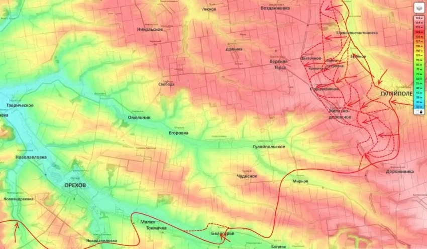 На данном участке российские бойцы продолжают движение вперёд, а именно к населённым пунктам Верхняя Терса и Гуляйпольское, пробиваясь во фланг Ореховской группировки противника.