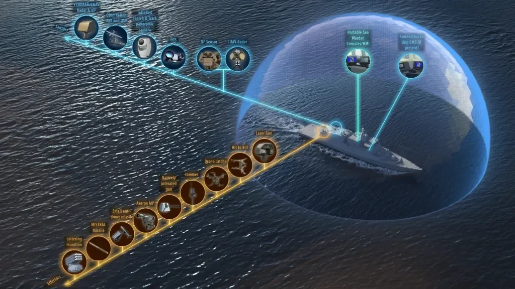 В составе Sky Warden должны работать разные средства перехвата или подавления. Так, на дальностях до 300-400 км предлагается использовать наземные пусковые устройства с улавливающими сетками или поражающими элементами. Также в систему могут интегрировать боевые лазеры, станции РЭБ, артиллерийские и ракетные системы. Дальний рубеж перехвата — ракеты Mistral с дальностью 8 км и высотой до 6 км.