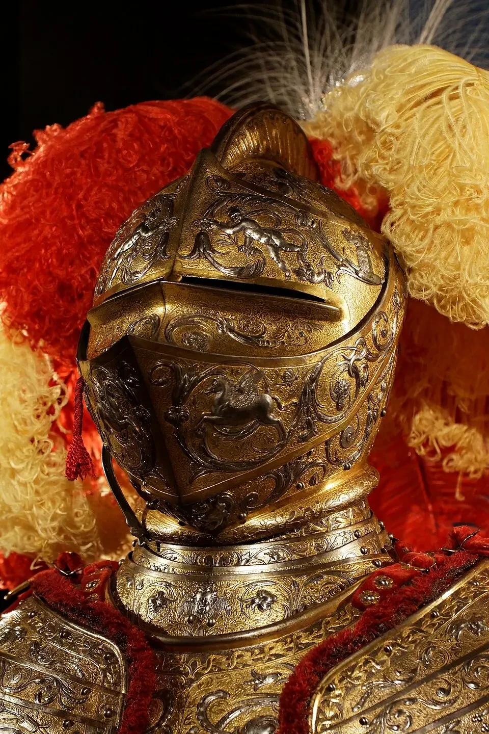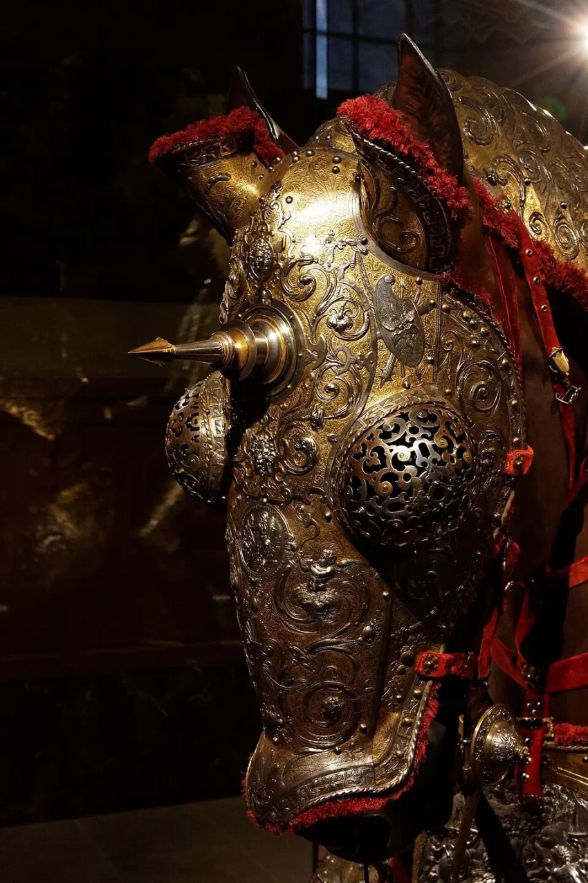 Самыми ранними доспехами, украшенными чеканкой, которые сохранились до нашего времени, — это конские латы императора Фридриха III, изготовленные в 1477 году. На их передней пластине можно видеть чеканное изображение полуфигуры ангела с распростертыми крыльями, а на задней – большого императорского орла по обеим его сторонам. Потом более чем тридцать лет ничего похожего не создавалось (или просто до нас не дошло), но вот уже со второго десятилетия XVI в. украшенных чеканкой доспехов становится все больше и больше: например, доспехи, хранящиеся в лондонском Тауэре, а также множество доспехов, созданных после 1530 года, находящихся в других музеях.